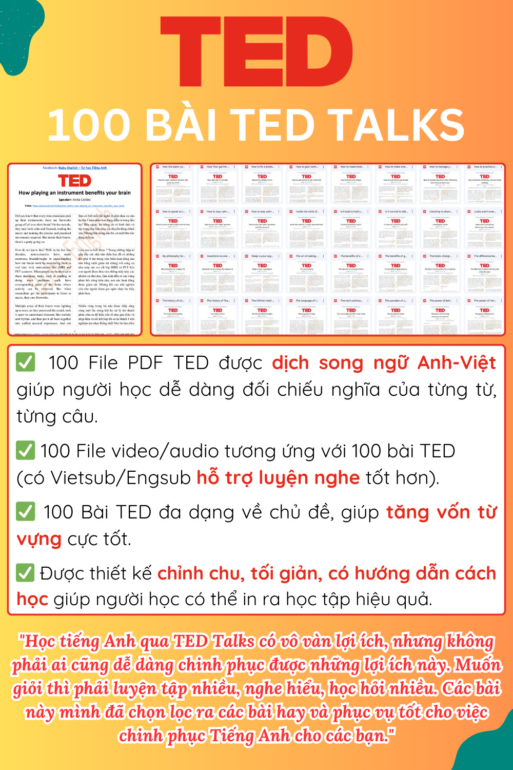 Đây không chỉ là một file PDF thông thường. Đây là công cụ tăng tốc giúp bạn biến những video TED Talks 15 phút thành bài học chất lượng cao mà không tốn công sức tra cứu.