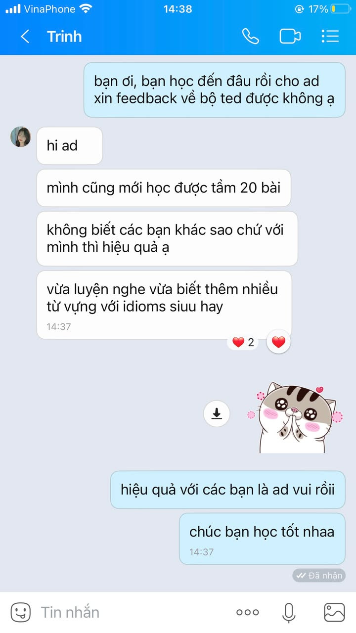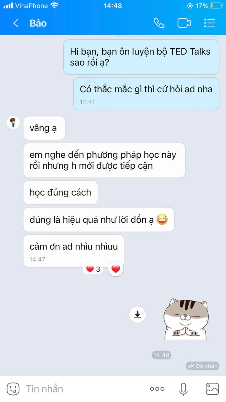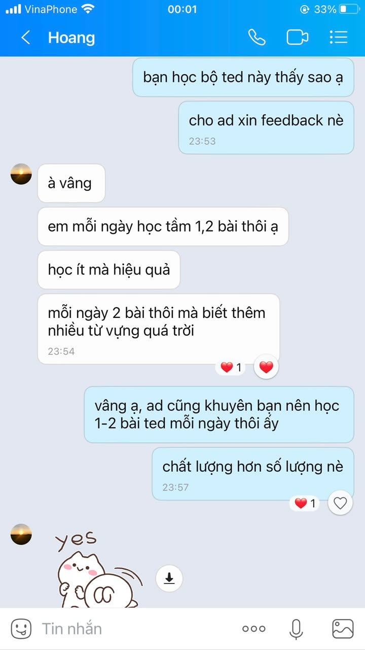 “Trước đây mình rất ngại nghe TED vì quá nhiều từ mới. Từ khi có bộ song ngữ này, mình học được rất nhiều cụm từ hay để áp dụng vào bài thi IELTS. Cảm giác hiểu trọn vẹn một bài diễn thuyết thật tuyệt vời!” — Minh Anh (IELTS - Band 7.5)
